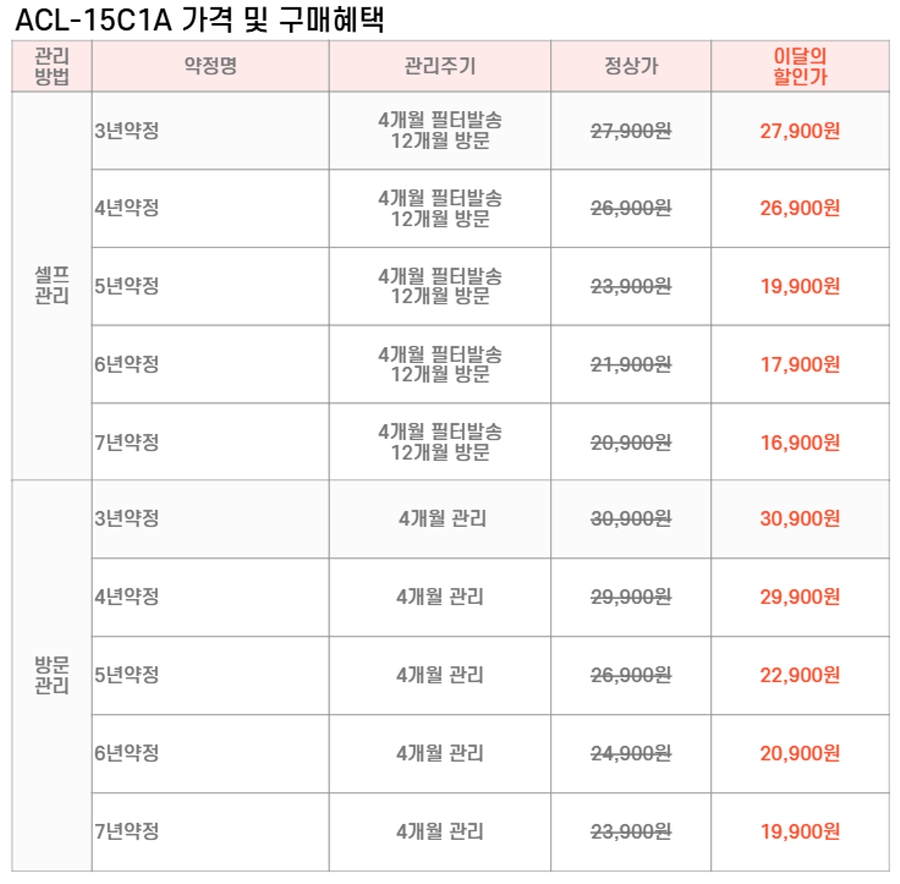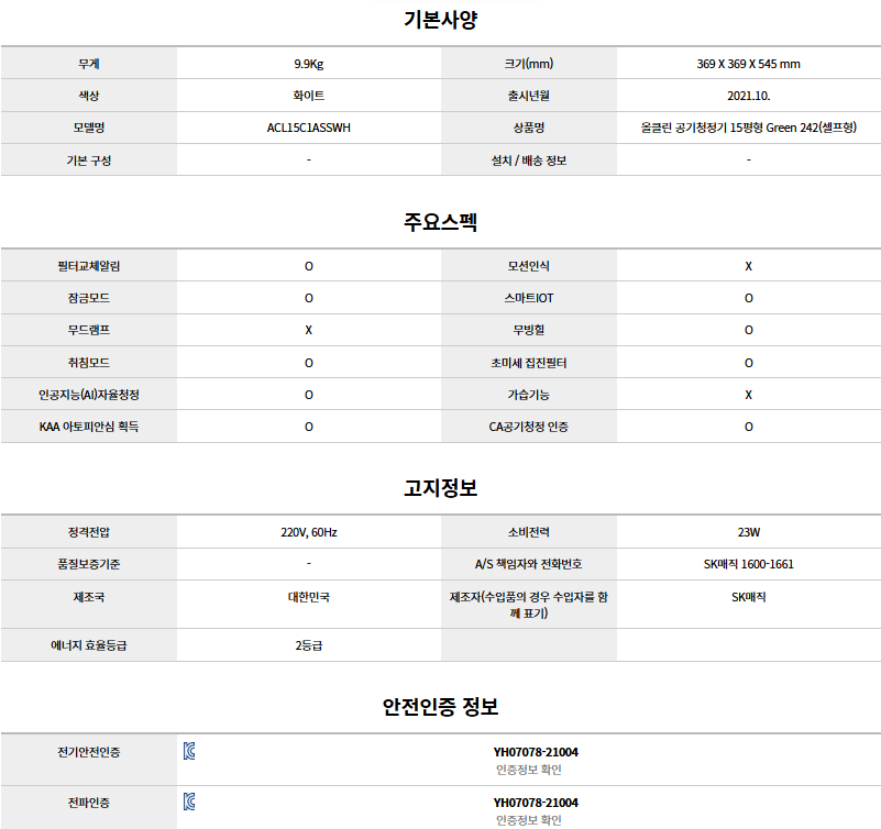 ACL-15C1A SK매직 [SK매직] 올클린 공기청정기 Green 242 15평형 제품분류 청정기 AS기간 렌탈기간내 최저 렌탈가 월 16,900 (렌탈가) 제휴카드 할인가 월 (렌탈가) 3년 4년 5년 6년 7년 셀프관리 방문관리/4개월 제품색상 선택 화이트 + 0원 할인 제휴카드 보기 렌탈신청 장바구니