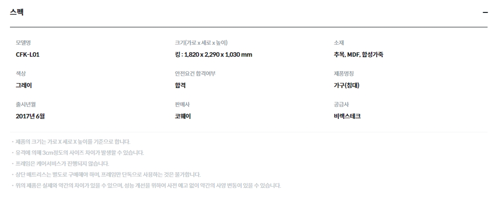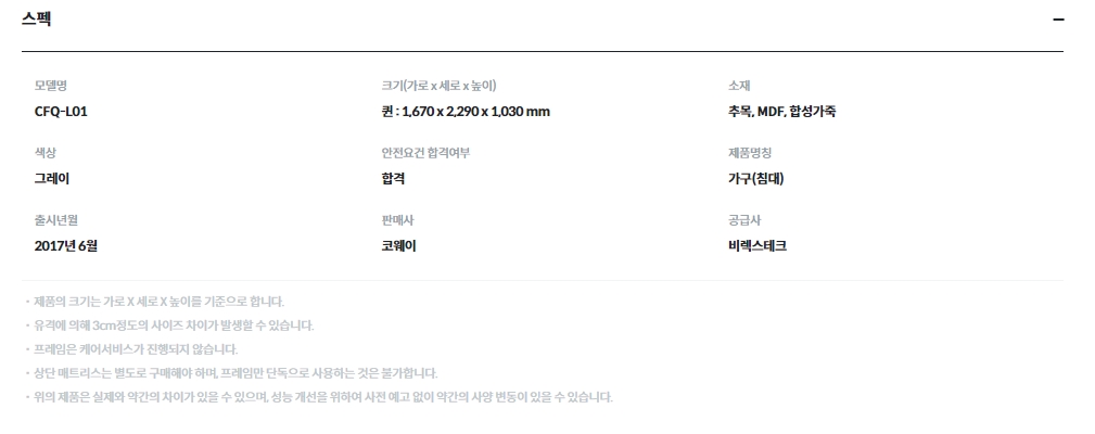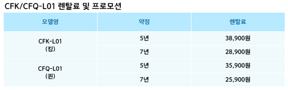 CFQ-L01,CFK-L01 코웨이 [코웨이] 단매트리스 프레임 (퀸,킹) 제품분류 침대 AS기간 렌탈기간내 최저 렌탈가 월 25,900 (렌탈가) 제휴카드 할인가 월 (렌탈가) 5년 7년 킹 퀸 할인 제휴카드 보기 렌탈신청 장바구니