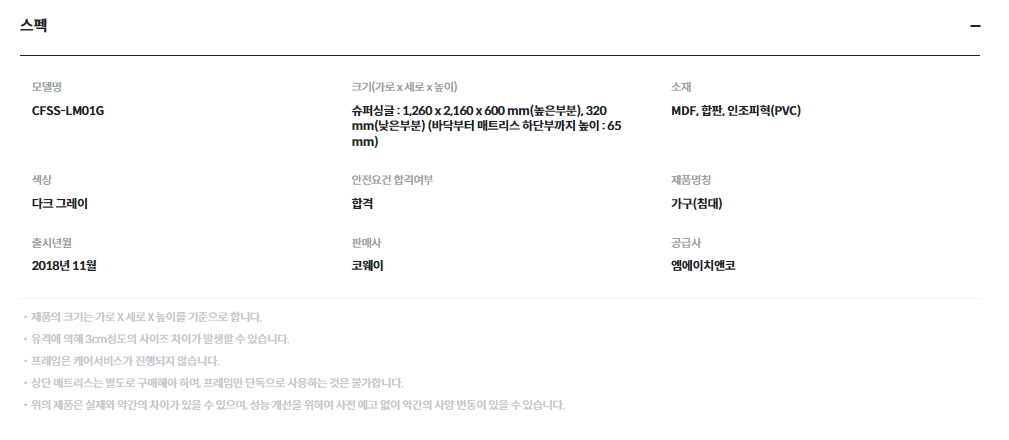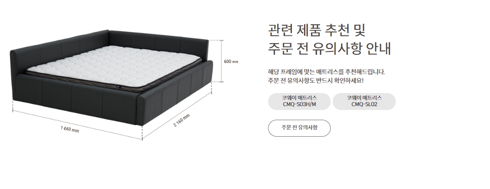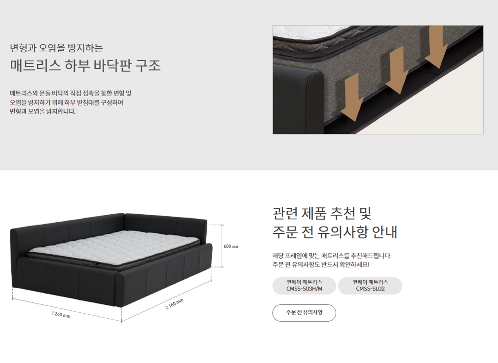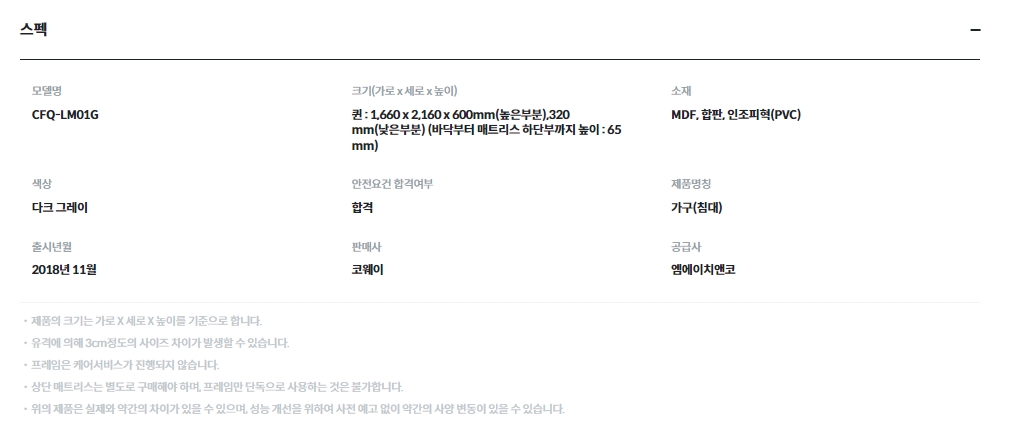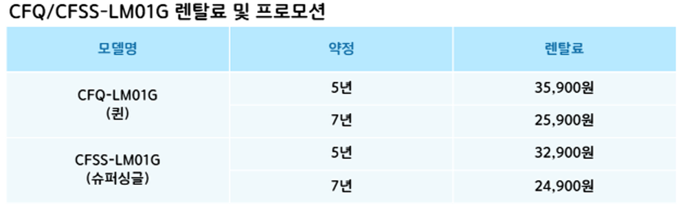 CFSS-LM01G,CFQ-LM01G 코웨이 [코웨이] 단매트리스 패밀리 프레임 (슈퍼싱글,퀸) 제품분류 침대 AS기간 렌탈기간내 최저 렌탈가 월 24,900 (렌탈가) 제휴카드 할인가 월 (렌탈가) 5년 7년 슈퍼싱글 퀸 할인 제휴카드 보기 렌탈신청 장바구니
