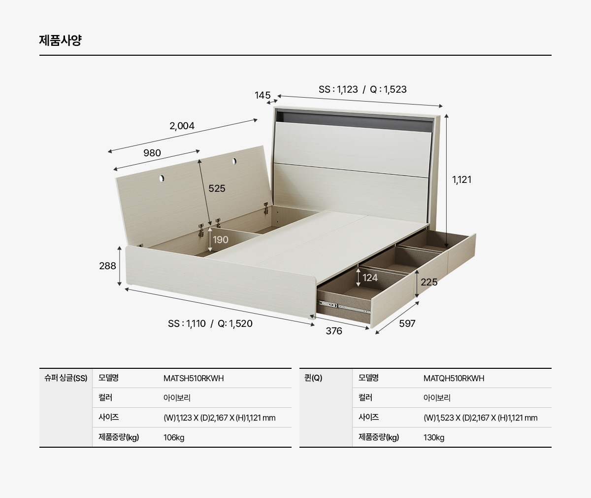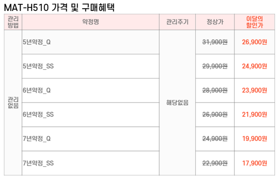 MAT-H510 SK매직 [SK매직] 수납형 프레임 헤드 제품분류 침대 AS기간 렌탈기간내 최저 렌탈가 월 17,900 (렌탈가) 제휴카드 할인가 월 (렌탈가) 5년 6년 7년 슈퍼싱글 퀸 할인 제휴카드 보기 렌탈신청 장바구니