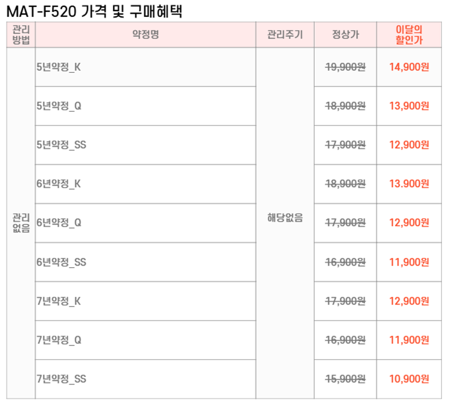 MAT-F520 SK매직 [SK매직] 패브릭 파운데이션 제품분류 침대 AS기간 렌탈기간내 최저 렌탈가 월 10,900 (렌탈가) 제휴카드 할인가 월 (렌탈가) 5년 6년 7년 슈퍼싱글 퀸 킹 할인 제휴카드 보기 렌탈신청 장바구니