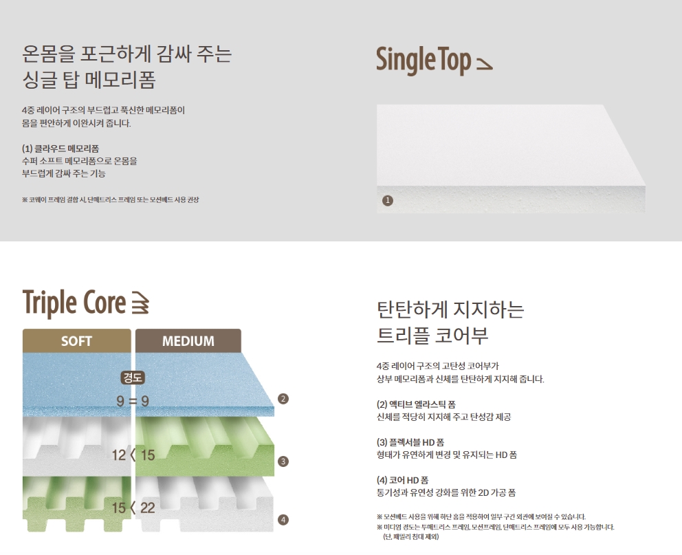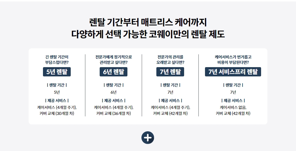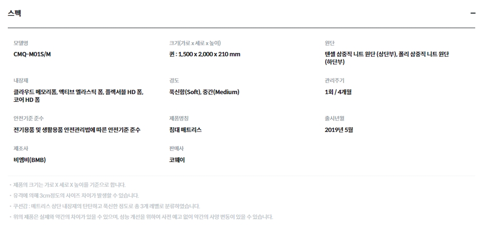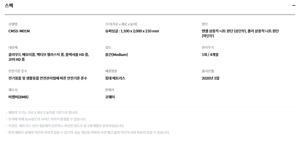 CMSS-M01,CMQ-M01 코웨이 [코웨이] 컴팩트 메모리폼 매트리스 (슈퍼싱글,퀸) 제품분류 매트리스 AS기간 렌탈기간내 최저 렌탈가 월 20,900 (렌탈가) 제휴카드 할인가 월 (렌탈가) 5년 7년 9년 슈퍼싱글 퀸 베이직케어 토탈케어 할인 제휴카드 보기 렌탈신청 장바구니