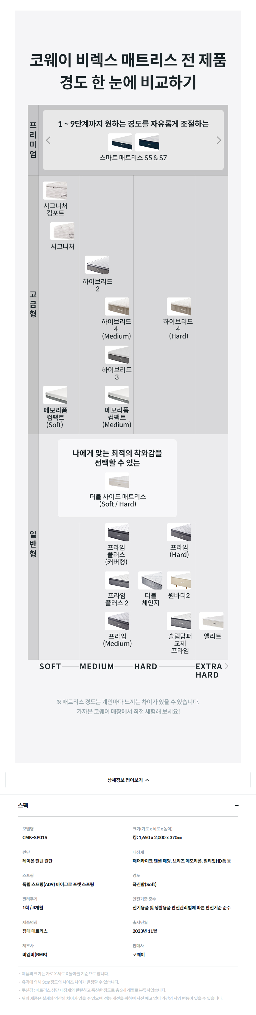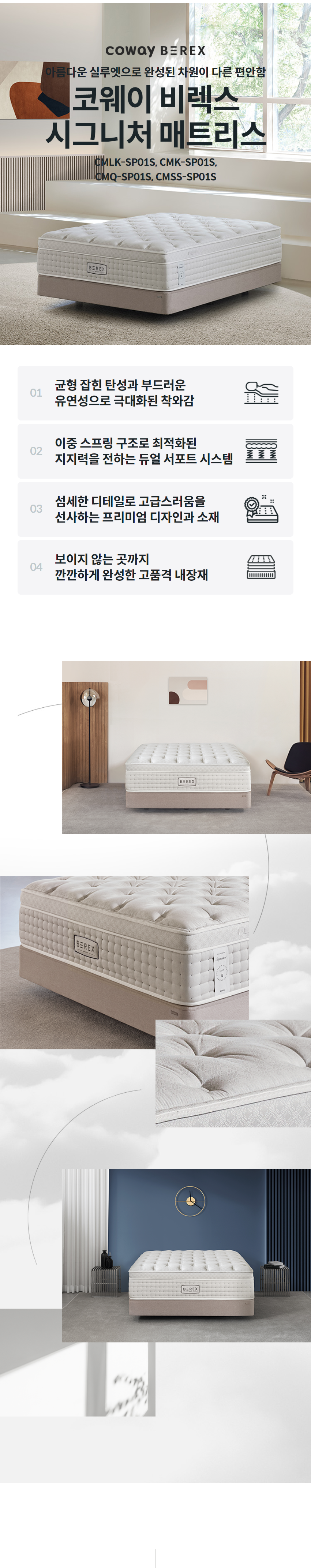 CMSS-SP01S,CMQ-SP01S,CMK-SP01S,CMLK-SP01S 코웨이 [코웨이] 비렉스 시그니처 매트리스 (슈퍼싱글,퀸,킹,라지킹) 제품분류 매트리스 AS기간 렌탈기간내 최저 렌탈가 월 41,900 (렌탈가) 제휴카드 할인가 월 (렌탈가) 5년 7년 9년 슈퍼싱글 퀸 킹 라지킹 서비스프리 베이직케어 할인 제휴카드 보기 렌탈신청 장바구니