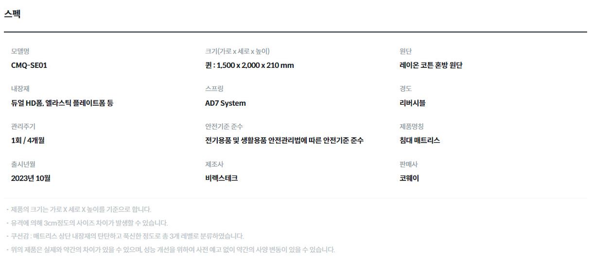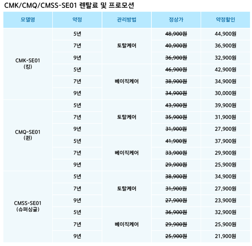 CMSS-SE01,CMQ-SE01,CMK-SE01 코웨이 [코웨이] 비렉스 더블사이드 매트리스 (슈퍼싱글,퀸,킹) 제품분류 매트리스 AS기간 렌탈기간내 최저 렌탈가 월 21,900 (렌탈가) 제휴카드 할인가 월 (렌탈가) 5년 7년 9년 슈퍼싱글 퀸 킹 베이직케어 토탈케어 할인 제휴카드 보기 렌탈신청 장바구니