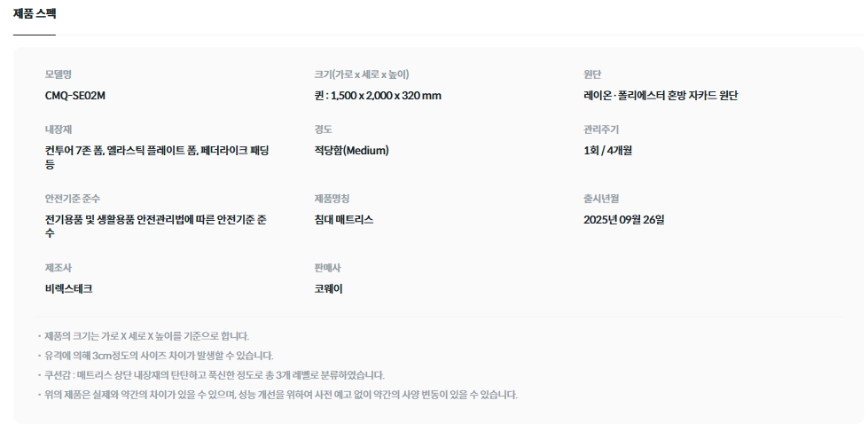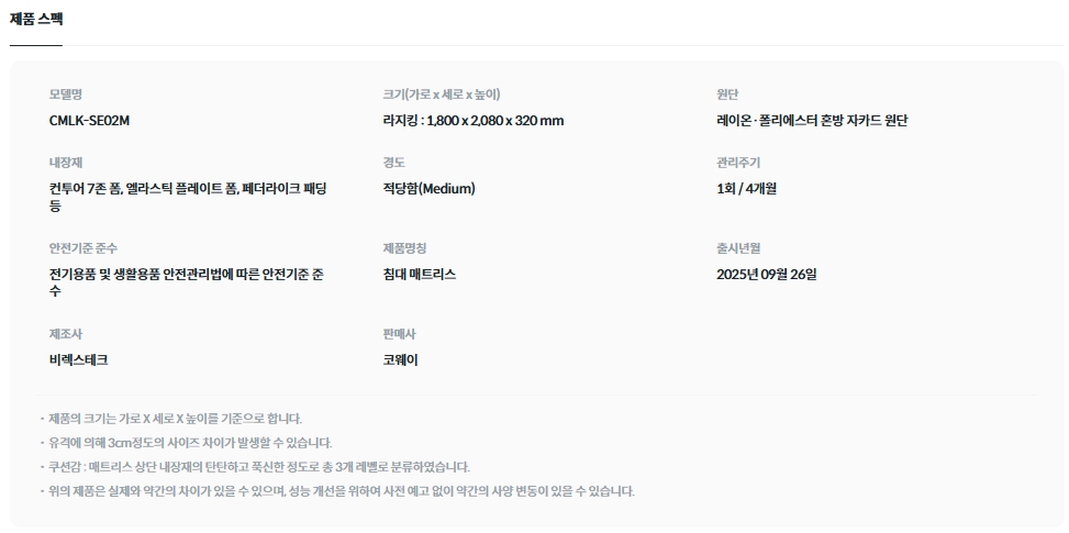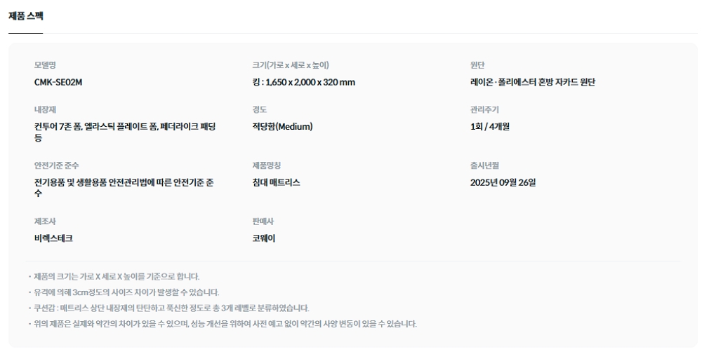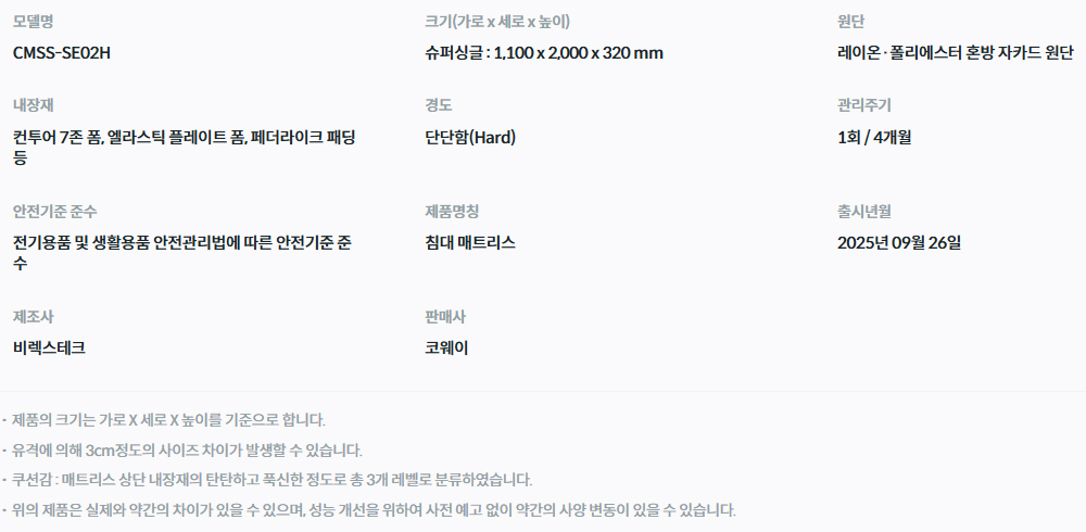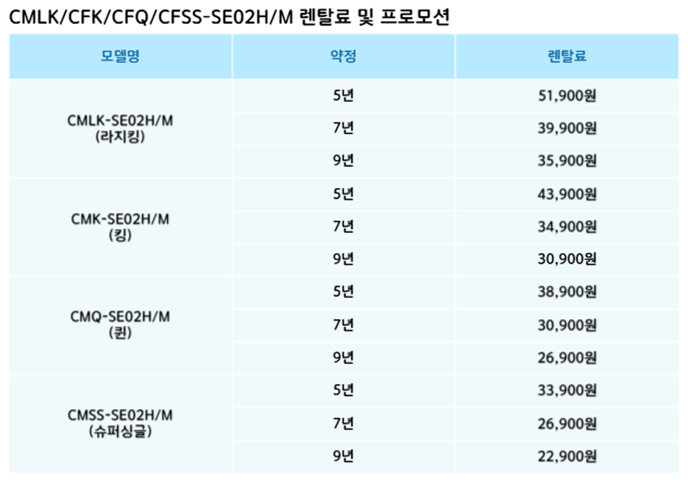 CMLK-SE02,CFK-SE02,CFQ-SE02,CFSS-SE02 코웨이 [코웨이] 비렉스 모디 매트리스 제품분류 매트리스 AS기간 렌탈기간내 최저 렌탈가 월 22,900 (렌탈가) 제휴카드 할인가 월 (렌탈가) 5년 7년 9년 슈퍼싱글 퀸 킹 라지킹 할인 제휴카드 보기 렌탈신청 장바구니