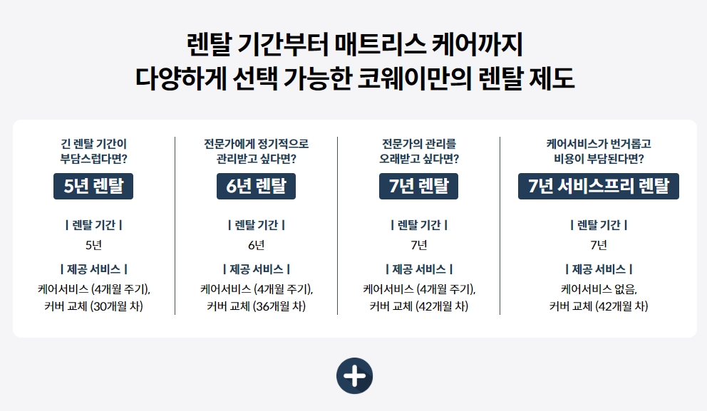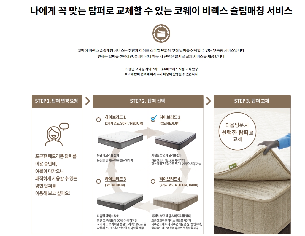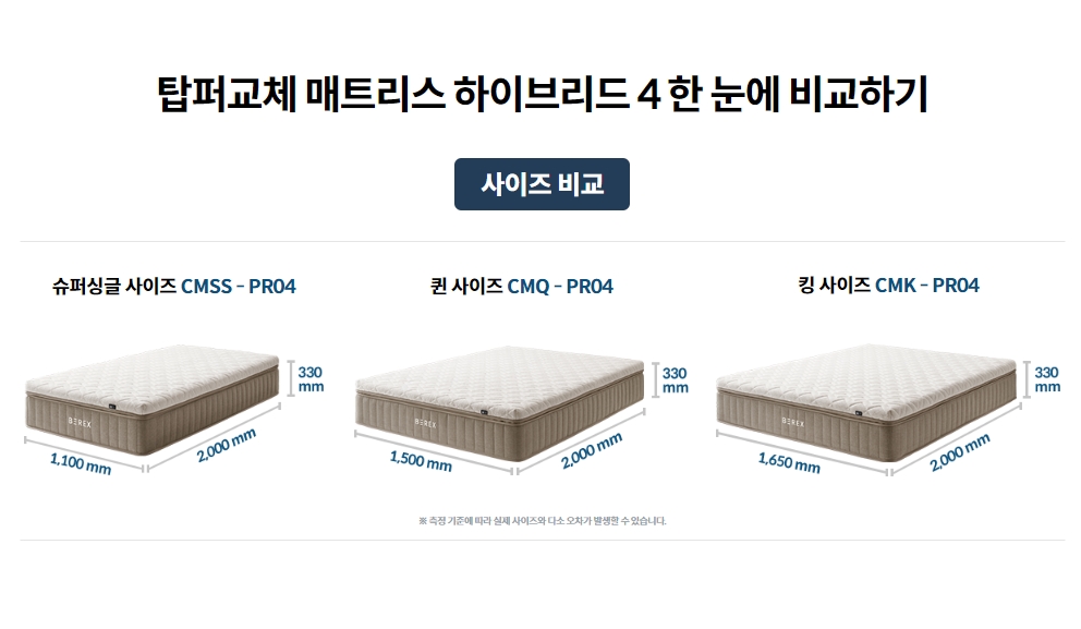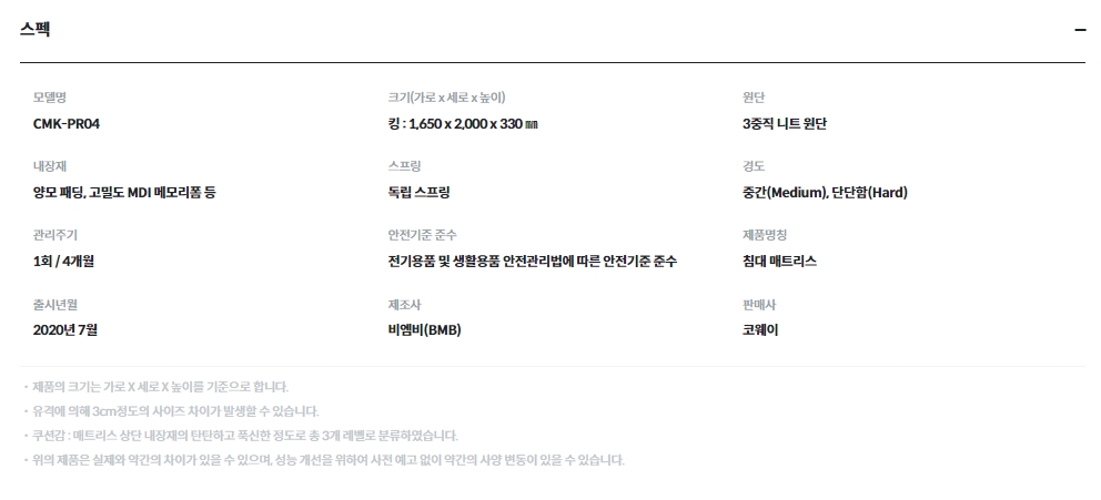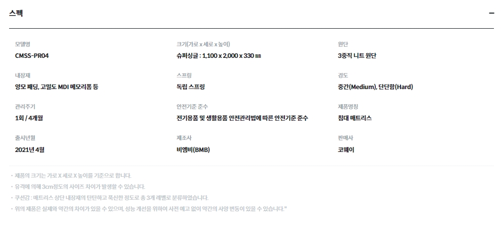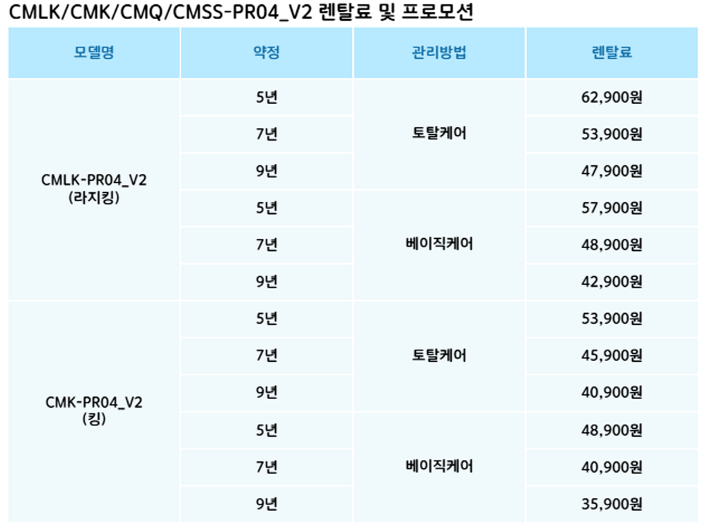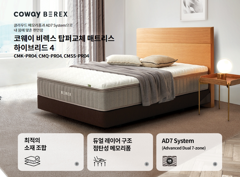 CMSS-PR04,CMQ-PR04,CMK-PR04,CMLK-PR04 코웨이 [코웨이] 탑퍼교체 하이브리드4 매트리스 (슈퍼싱글,퀸,킹,라지킹) 제품분류 매트리스 AS기간 렌탈기간내 최저 렌탈가 월 25,900 (렌탈가) 제휴카드 할인가 월 (렌탈가) 5년 7년 9년 슈퍼싱글 퀸 킹 라지킹 베이직케어 토탈케어 할인 제휴카드 보기 렌탈신청 장바구니