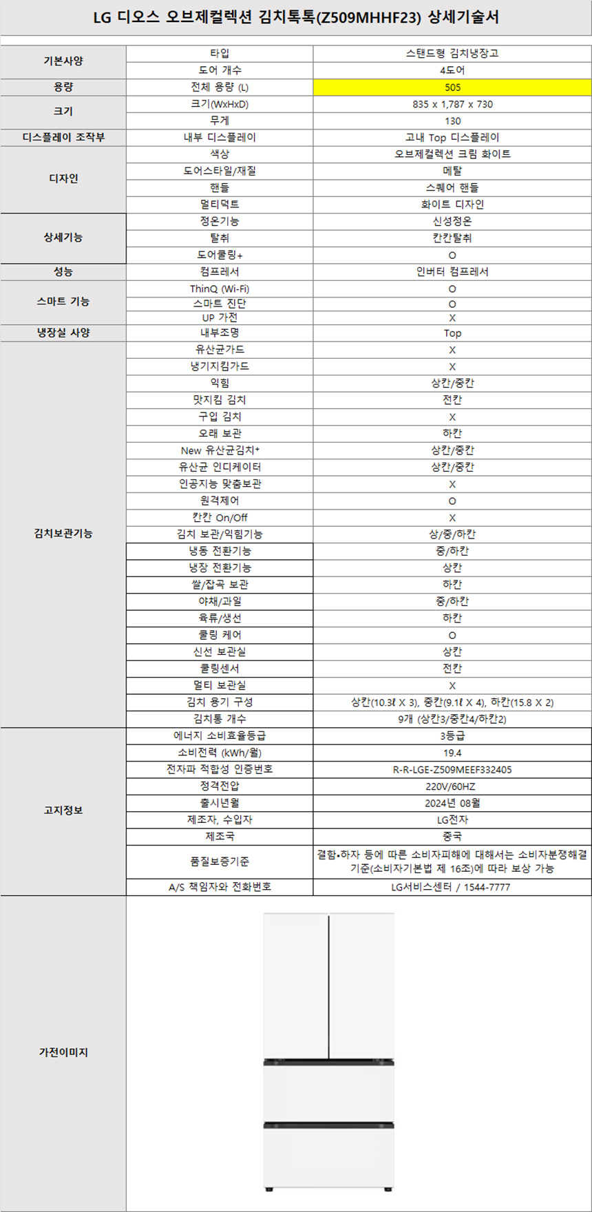 [LG] 오브제컬렉션 김치톡톡 김치냉장고 505L 크림화이트
