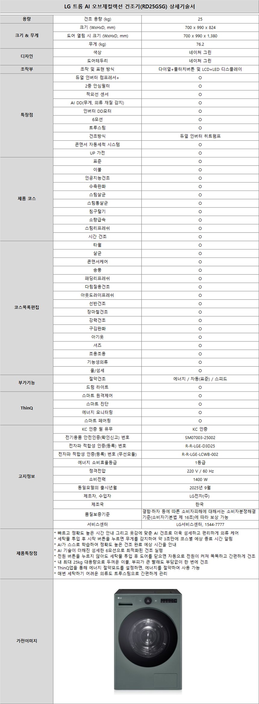 RD25GSG 소노아임레디 [LG] 트롬 AI 오브제컬렉션 건조기 25kg 네이처그린 제품분류 생활가전 용량(총량) 25KG 구좌 4구좌 AS기간 1년 최저 렌탈가 월 66,000 (렌탈가) 제휴카드 할인가 월 (렌탈가) 1-200회 할인 제휴카드 보기 렌탈신청 장바구니