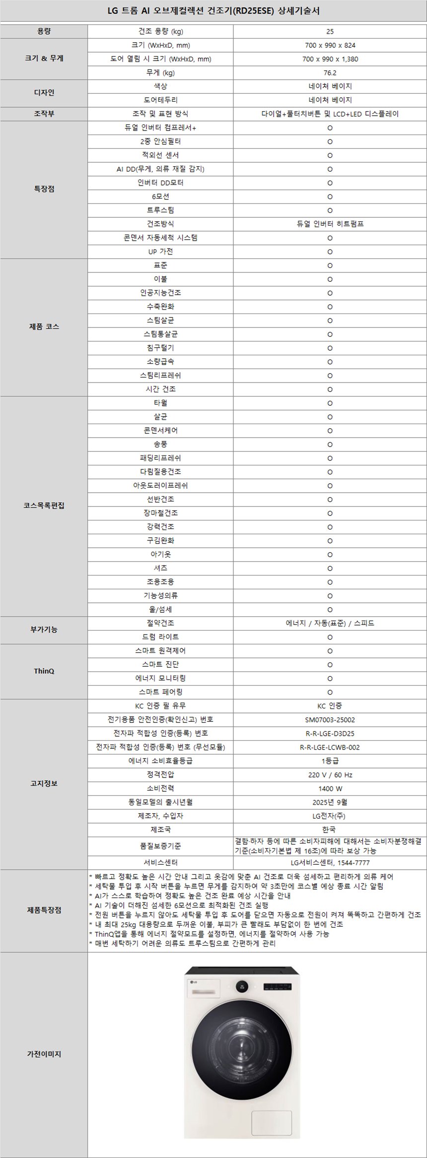 RD25ESE 소노아임레디 [LG] 트롬 AI 오브제컬렉션 건조기 25kg 네이처베이지 제품분류 생활가전 용량(총량) 25KG 구좌 4구좌 AS기간 1년 최저 렌탈가 월 66,000 (렌탈가) 제휴카드 할인가 월 (렌탈가) 1-200회 할인 제휴카드 보기 렌탈신청 장바구니