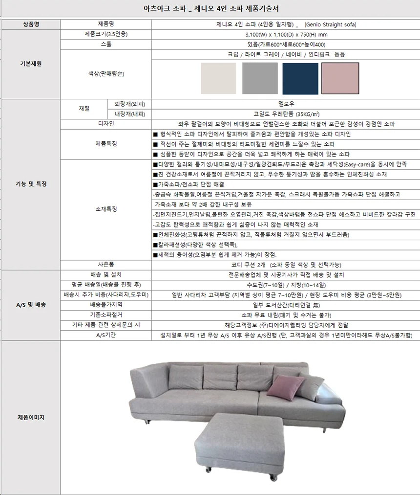 제니오(일자형+스툴) 소노아임레디 [아츠아크] 제니오 4인 일자형 소파 제품분류 가구/침대 구좌 6구좌 AS기간 1년 최저 렌탈가 월 99,000 (렌탈가) 제휴카드 할인가 월 (렌탈가) 1-200회 제품색상 선택 화이트 + 0원 크림 + 0원 라이트그레이 + 0원 핑크 + 0원 스카이블루 + 0원 그레이 + 0원 옐로우 + 0원 그린 + 0원 딥그레이 + 0원 오렌지 + 0원 네이비 + 0원 차콜 + 0원 할인 제휴카드 보기 렌탈신청 장바구니