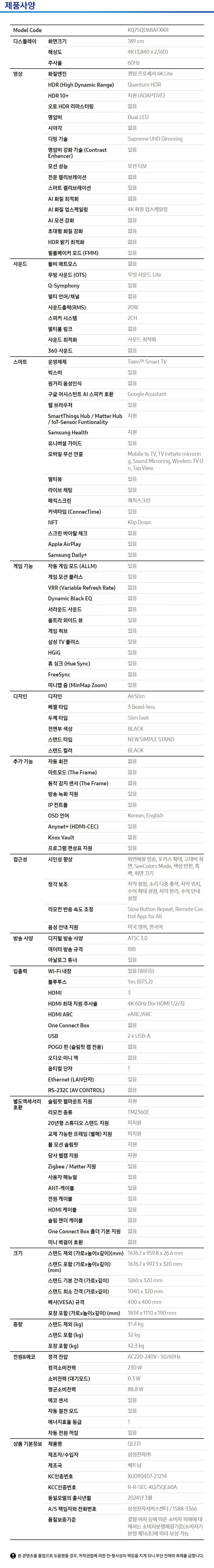 KQ75QD68AFXKR+HW-B400F/KR 소노아임레디 [삼성] QLED TV 75인치+사운드 바 제품분류 결합상품 제품규격 75인치 구좌 4구좌 AS기간 1년 최저 렌탈가 월 66,000 (렌탈가) 제휴카드 할인가 월 (렌탈가) 1-200회 할인 제휴카드 보기 렌탈신청 장바구니